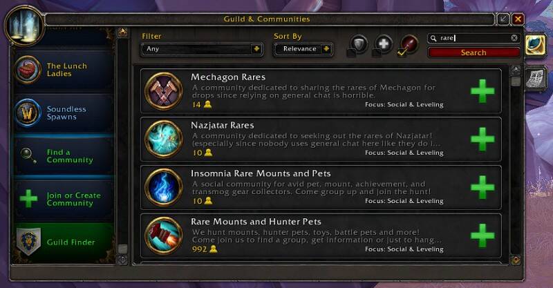 Per trovare un gruppo con cui giocare, il gioco mette a disposizione la funzione di Ricerca di Community e Gilde, che sono fondamentalmente la stessa cosa, con l'unica differenza che le GILDE hanno il limite del REAME (Realm).